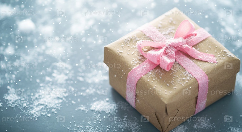 Подарок, завернутый в коричневую бумагу с розовой лентой, лежит на заснеженной поверхности во время зимнего праздника