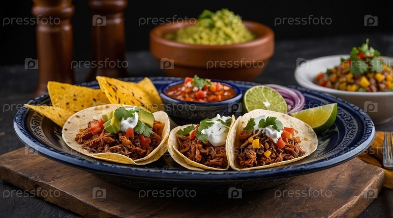 Ароматная тарелка с традиционными блюдами, включающая рис со специями, украшенный свежими овощами, подается с цитрусовыми, авокадо и теплым напитком на деревянном столе