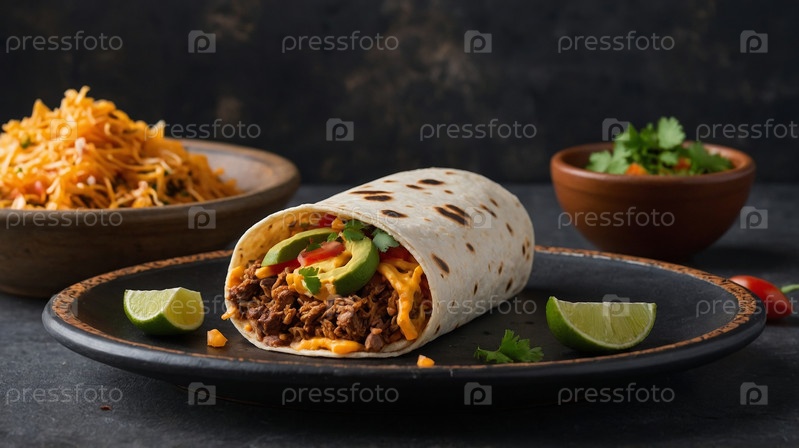 Сытный буррито с сочным приправленным мясом, свежими помидорами, салатом и плавленым сыром, завернутый в теплую тортилью, покоится на темной поверхности, демонстрируя яркие ингредиенты