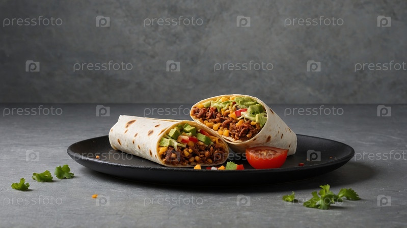 Ароматный тако, наполненный свежими овощами и сыром, подается на синей тарелке в сопровождении гарниров из сальсы, риса и свежего лайма, создавая праздничную атмосферу застолья