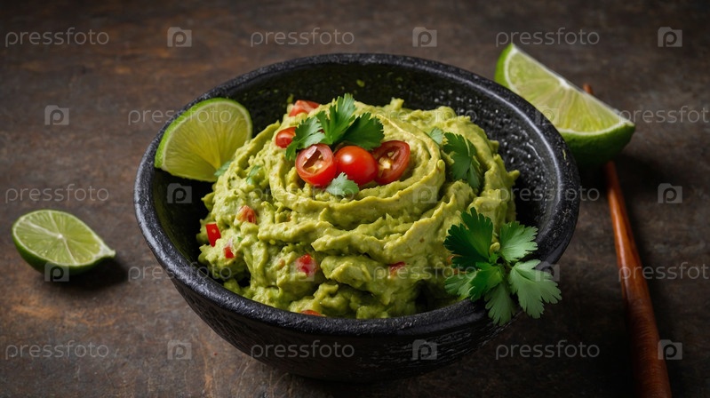 Нежный гуакамоле из спелых авокадо, украшенный нарезанным перцем чили, свежей кинзой и дольками лайма, выложенными на фактурной поверхности