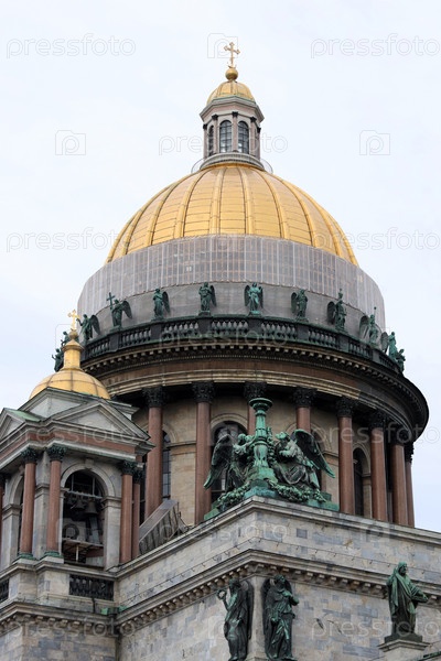 Золотой купол и декоративные бронзовые элементы православного храма Исаакиевского собора (Собора Святого Исаакия Далматского) в Санкт-Петербурге