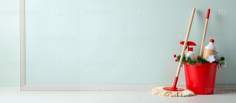 Рождественский баннер для клининговых служб. Ведерки, мотыльки, чистящие средства, украшенные елкой и снежинками. Copyspace, для текста