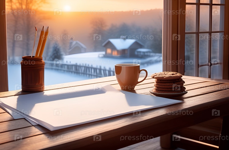 ?творческое зимнее утро: уютный уголок с кофе, печеньем и принадлежностями для рисования у окна с видом на заснеженную сельскую местность