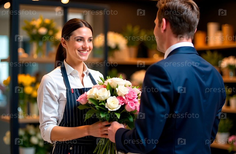 Флористка в цветочном магазине обслуживает покупателя-мужчину, продавая ему букет роз