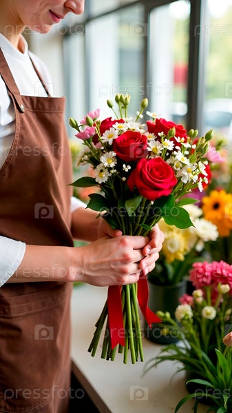 Неузнаваемая женщина-флорист в цветочном магазине с любовью собирает разные цветы в букет. Крупный план
