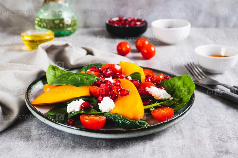 Свежий салат из хурмы, помидоров черри, рикотты, шпината и граната на тарелке на столе