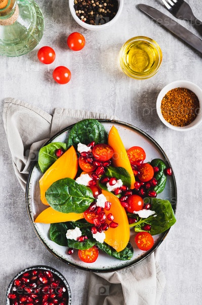 Фруктовый и овощной салат с хурмой на тарелке на столешнице и вертикальный вид