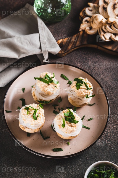 Закуска из грибов, фунчозы и рыбной икры на тарелке на столе вертикальный вид