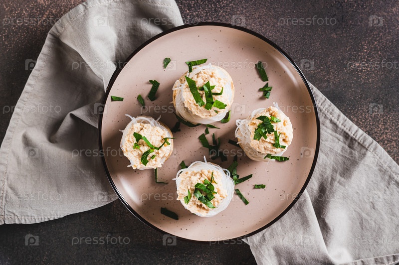 Крупный план закуски из шампиньонов, фунчозы и икры мойвы на тарелке вид сверху