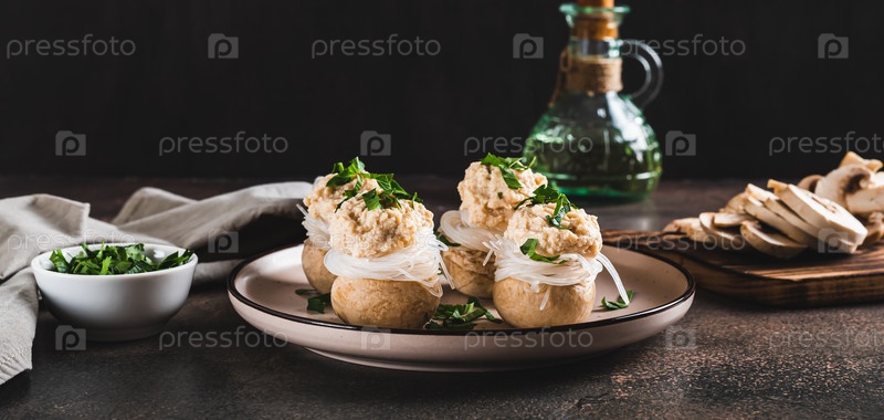 Закуска из шампиньонов, фунчозы и икры мойвы на тарелке на столе веб-баннер