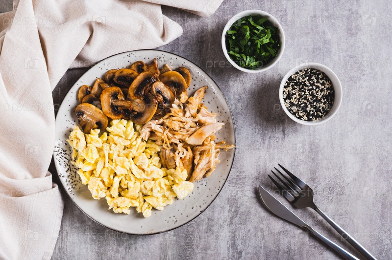 Яичница, жареная курица и шампиньоны на тарелке на столешнице