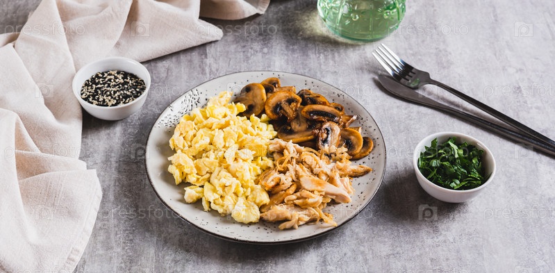Яичница, жареная курица и шампиньоны на тарелке на столе веб-баннер