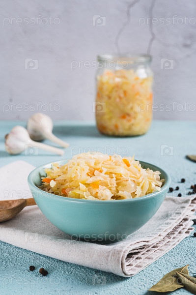Маринованная квашеная капуста с морковью в миске на столе вертикальный вид