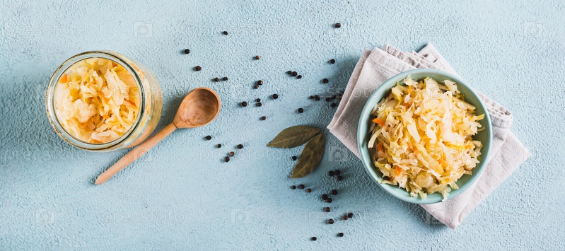 Домашняя квашеная капуста в миске на столешнице веб-баннер