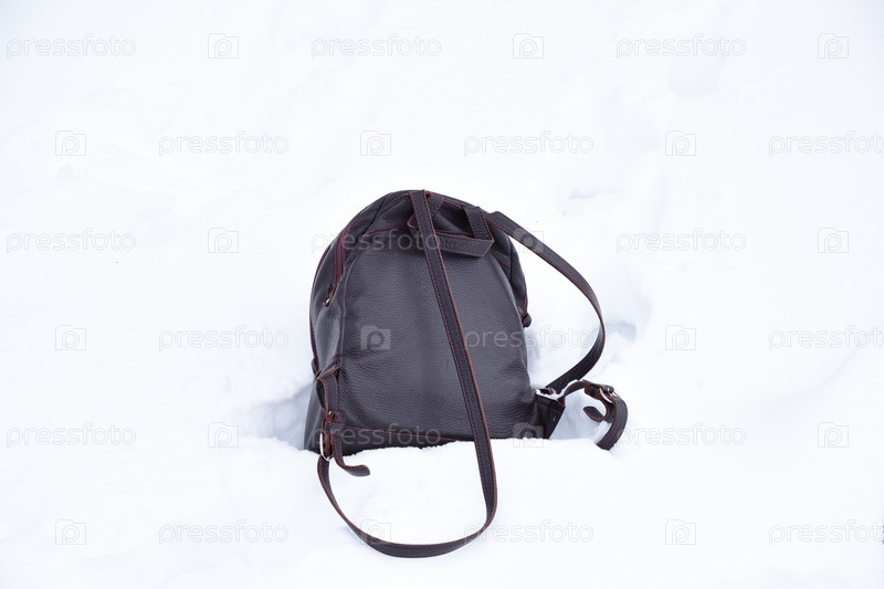 Черная кожаная сумка-рюкзак лежит в глубоком снегу
