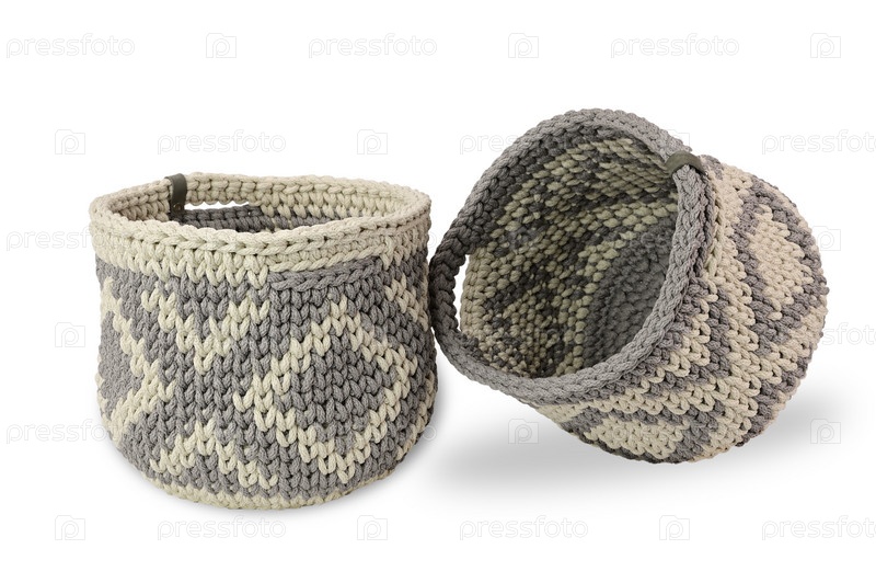 Две корзины крючком с зеркальным узором из толстой пряжи. Одна корзина слегка наклонена, опираясь на другую