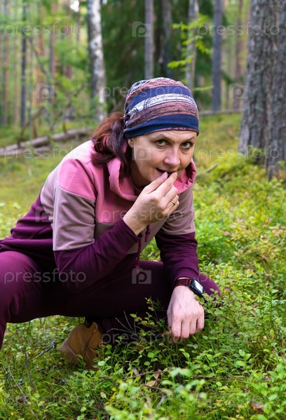 Привлекательная взрослая женщина собирает чернику в лесу
