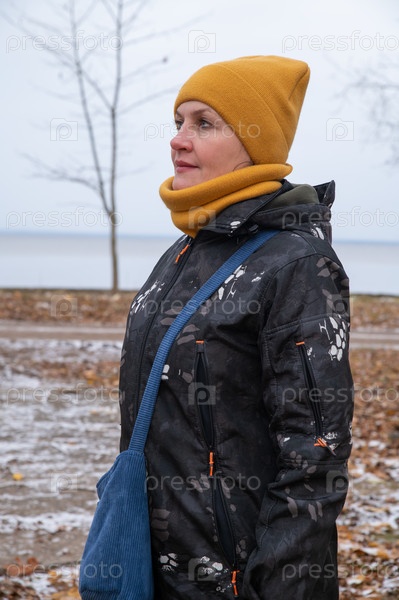 Привлекательная взрослая женщина в теплой повседневной одежде прогуливается по зимнему берегу залива