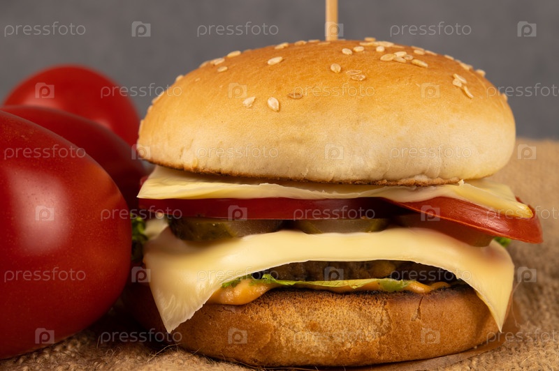 Поджаренный гамбургер в кунжутной булочке с солеными огурцами и спелыми помидорами. Из него торчат белые листочки плавленого сыра