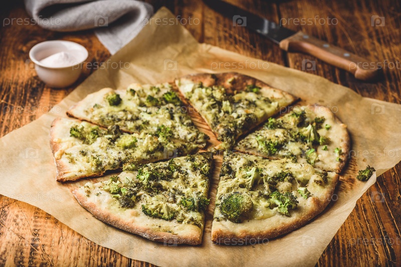 Домашняя пицца с брокколи, соусом песто и сыром