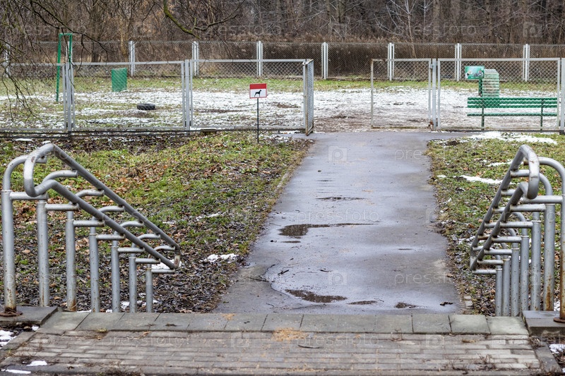 Снимок игровой площадки для собак в зимнем парке. На открытом воздухе