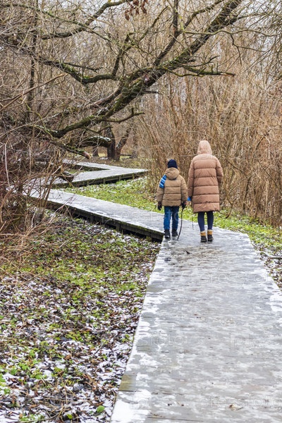 Женщина идет с сыном по деревянной дорожке в зимнем парке. Концепция