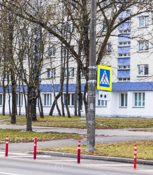 Дорожные знаки пешеходного перехода и людей с ограниченными возможностями по зрению. Город