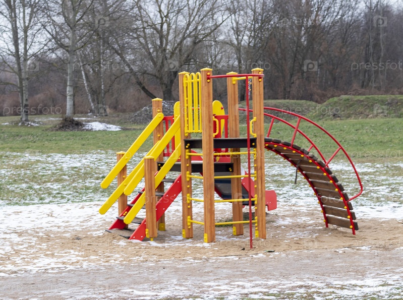 Яркая детская площадка в зимнем парке. На улице