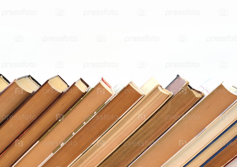 Стопка старых книг на белом фоне, разложенных под наклоном
