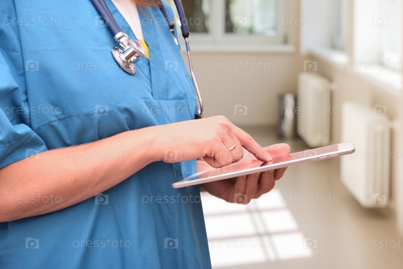 Врач со стетоскопом на шее держит в руке планшетный компьютер и водит пальцем по экрану