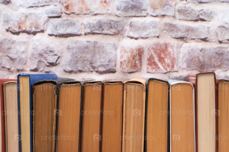 Корешки старых книг, сложенные вертикально на фоне кирпичной стены