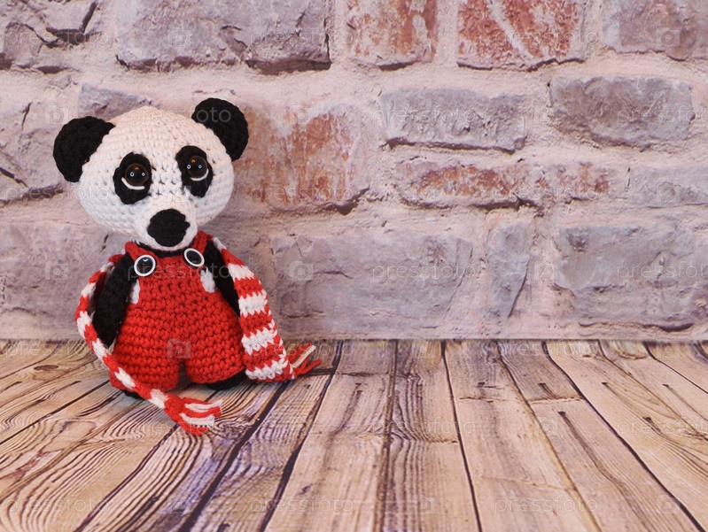 Вязаная панда с шарфом на фоне кирпичной стены
