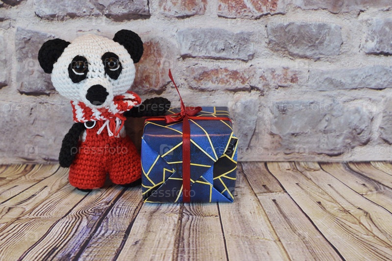 Панда, связанная крючком, стоит рядом с подарочной коробкой, положив на нее одну лапу
