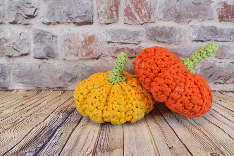 Две вязаные тыквы лежат на деревянном полу на фоне кирпичной стены