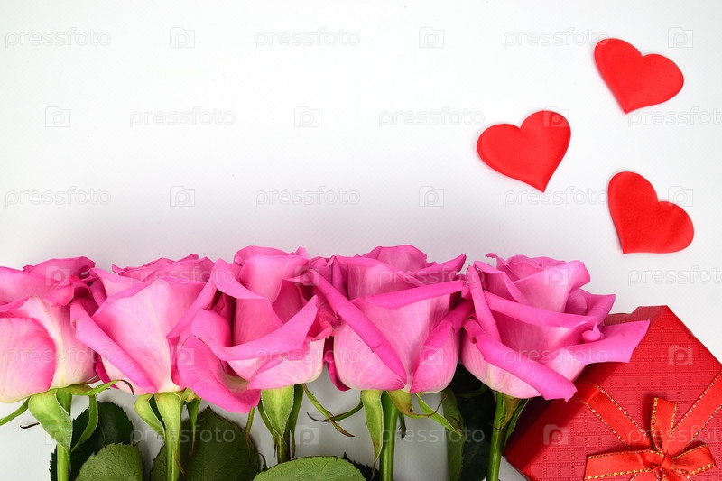 Розы выстроены в ряд рядом с красной подарочной коробкой и тремя декоративными сердечками