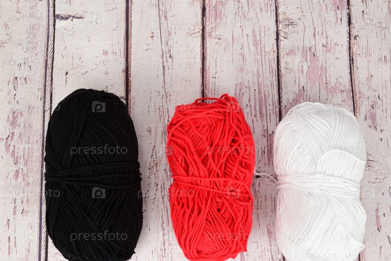 Черные, красные и белые мотки шерстяной пряжи для вязания крючком лежат на светлой деревянной поверхности