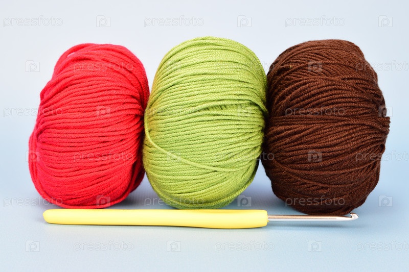 Красные, зеленые и коричневые мотки шерсти, расположенные вертикально в ряд. На переднем плане — крючок для вязания