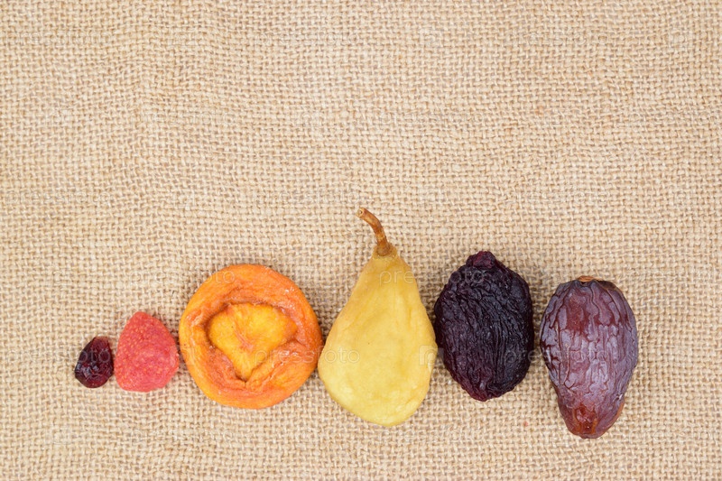 Различные сухофрукты, разложенные в ряд на коврике
