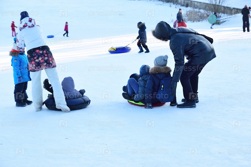 Женщина катает детей на надувном тюбе с горы