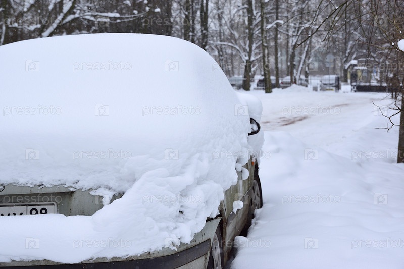 Машина припаркована на обочине дороги и покрыта толстым слоем снега