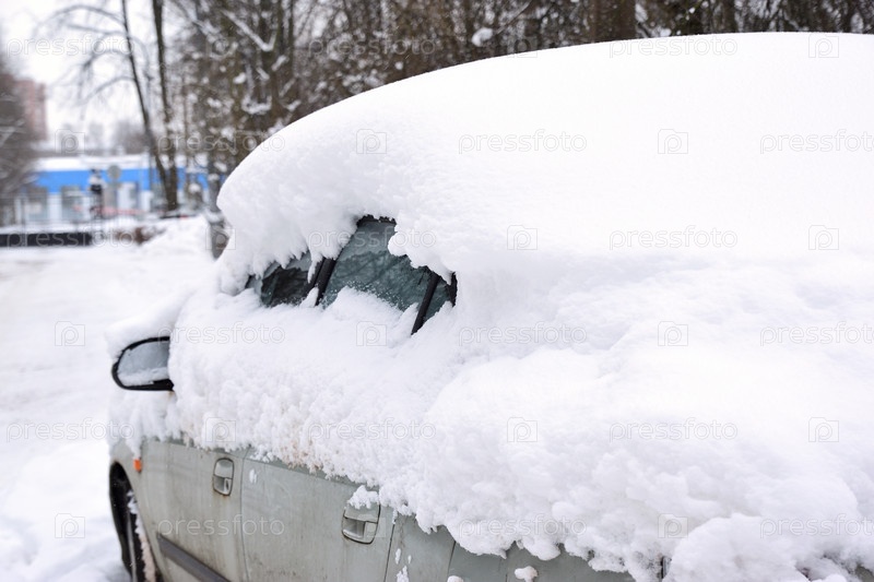 Автомобиль, покрытый толстым слоем снега на городской улице
