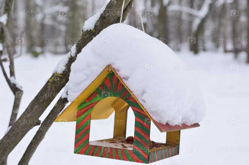 Кормушка для птиц на кустах в городском парке с толстым слоем снега на крыше