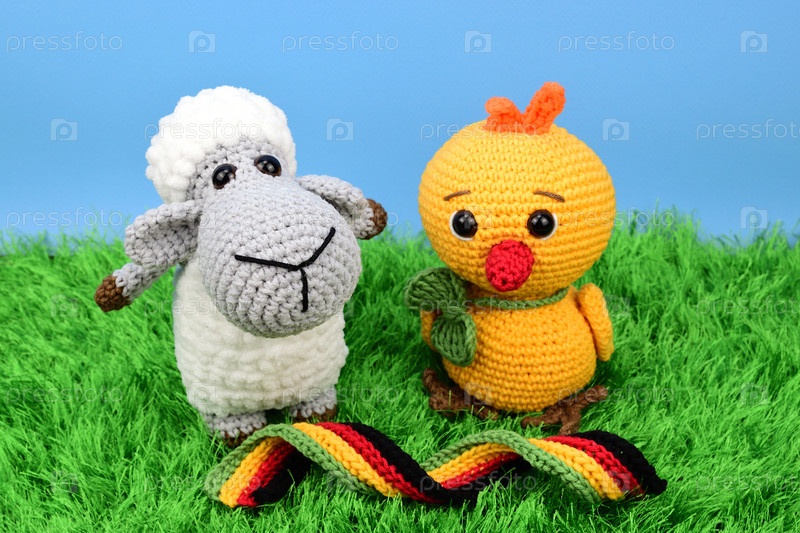 Пасхальный ягненок и цыпленок, связаны из толстой пряжи. На переднем плане - пасхальная лента