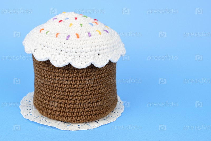 Вязаный пасхальный кулич на узорчатой белой салфетке