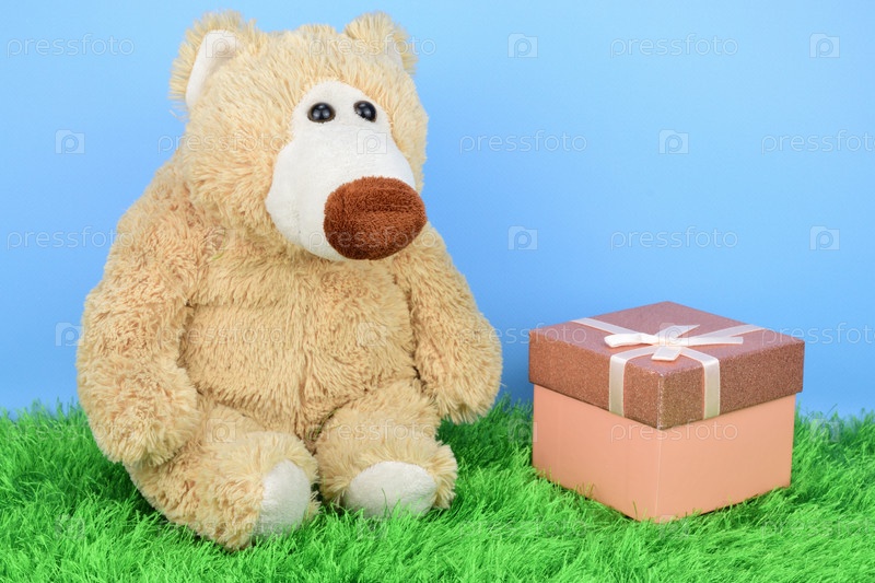 Плюшевый мишка сидит на зеленой траве рядом с подарочной коробкой