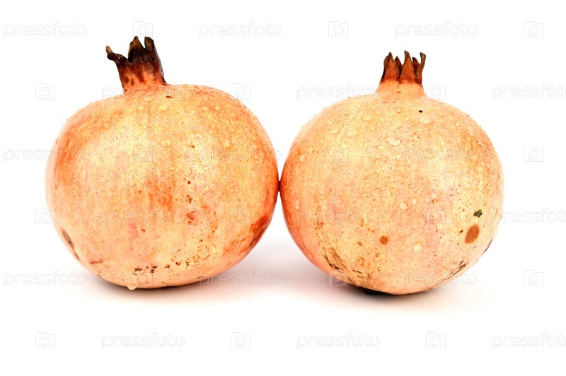 Два неочищенных граната с почерневшими высушенными черенками и капельками воды на кожуре