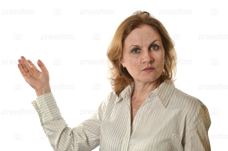 Взрослая женщина, брюнетка, в светлой блузке, правой рукой указывает на что-то за спиной