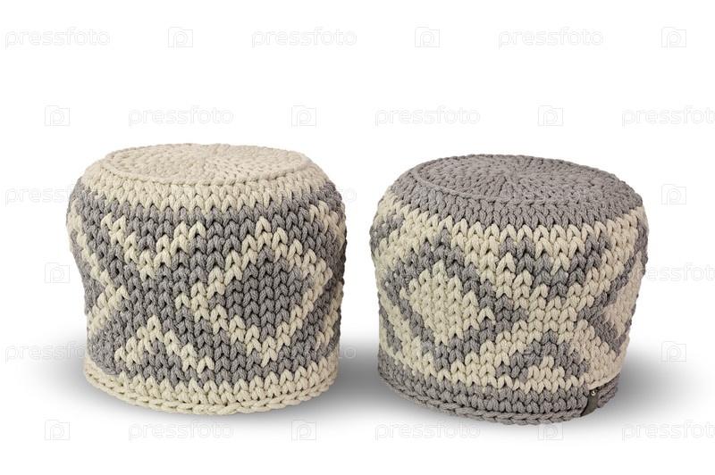 Две корзины, связанные крючком из толстой пряжи. Корзины перевернуты вверх дном
