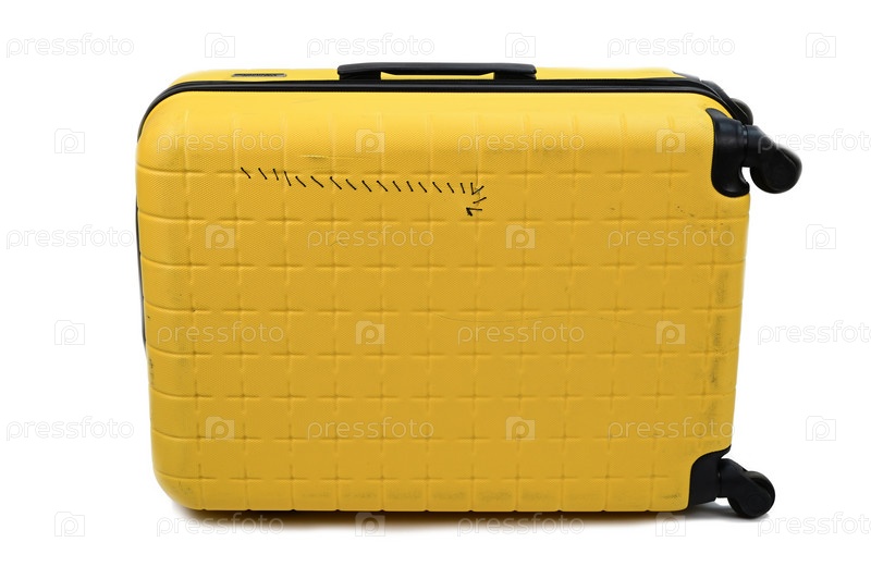 Большой желтый пластиковый чемодан на колесах с трещиной сбоку, зашитой черными нитками